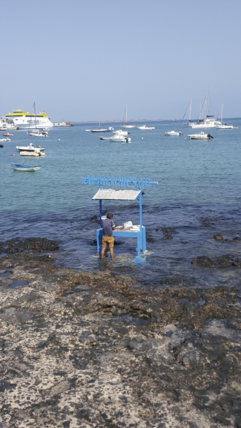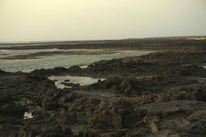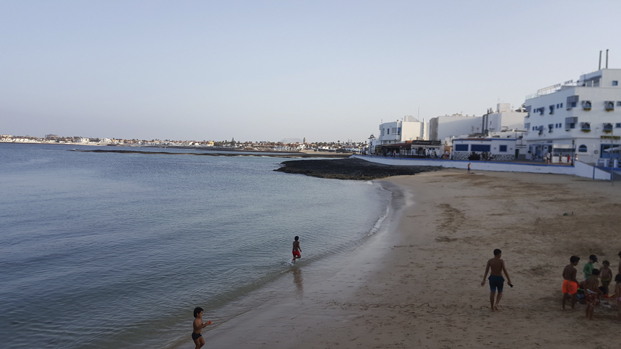 Un delicioso baño y un largo paseo por la orilla nos llevan de una playa a otra que tras las mareas cambian de silueta. Las rocas se llenan de caracolillos y otros animales que viven en los charcos que se forman. Hay poca gente ya que son kilométricas. Nudistas, familias y ambiente surfero conviven al borde del mar. Protectores del viento de piedra volcánica como de si casitas se tratara se intercalan en la playa. Al fondo, la Isla de Lobos a la que realizamos una excursión y que os contaremos más adelante. Después de disfrutar tanto del salvaje entorno y del mar nos dirigimos a tomar algo y a conocer el pueblo de Corralejo