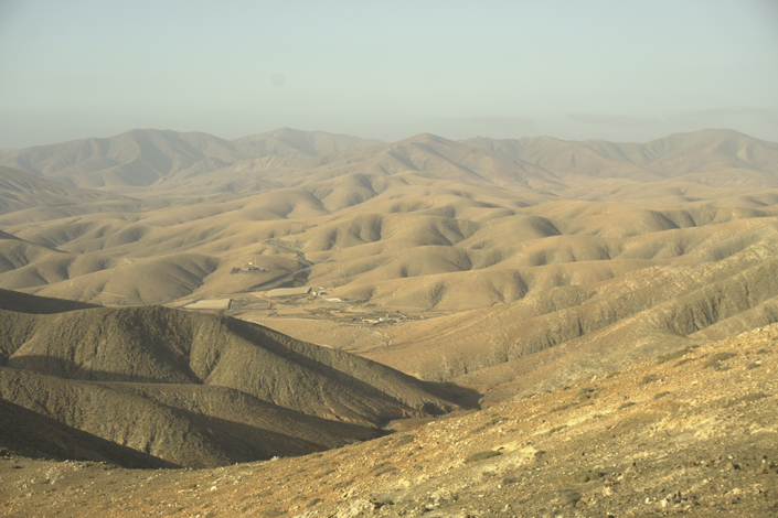 De vuelta a nuestro hotel cogimos una ruta alternativa muy recomendable dada la maravilla del paisaje interior de la isla. Se trata de la carretera FV 605 que sale de Costa Calma hasta Pájara y FV30 hasta Betancuria, antigua capital de la Isla. Un recorrido que pasa por varios miradores astronómicos en los que merece la pena hacer una parada a contemplar un singular entorno desertico de grandes barrancos, dunas y macizos montañosos de distintas formas y colores. Una carretera entre ondulantes colinas volcánicas, cactus y granjas de cabras.