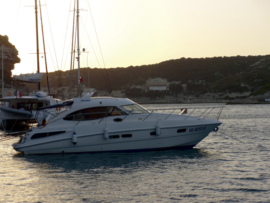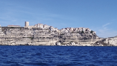 A la mañana siguiente, una vez que hicimos acopio de provisiones e informándonos de la previsión del tiempo, partimos en dirección este de la isla, donde predominan escarpados acantilados. Ya en ruta y nada más pasar la bocana nos topamos con la panorámica de Bonifacio desde el agua, arriba, exhibiéndose al mar. La vista es pintoresca. Las casas colocadas al filo del escarpado nos recuerdan a las casas colgantes de Cuenca, con la salvedad de que estas tienen el inmenso mar a sus pies. La ciudadela en un extremo y las formas erosionadas de la roca, dejan un paisaje de postal.
