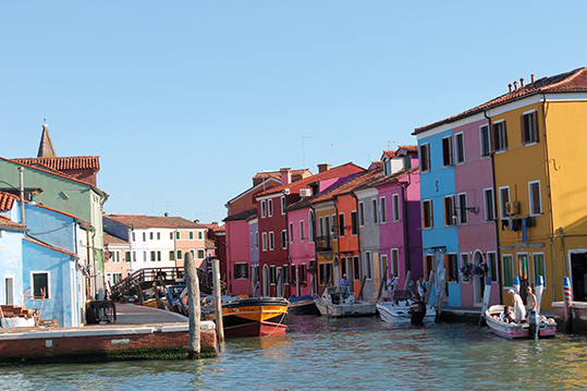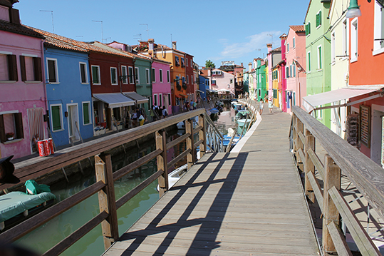 Burano es una isla de la laguna de Venecia, situada a 7 kilómetros. Un lugar pictórico donde destacan las fachadas de vivos colores de sus casas. Cada rincón es de fotografía. La única iglesia está dedicada a San Martín, y es famosa por su campanario que es considerado el símbolo de la isla. Esta localidad ha conservado el carácter de pueblo pesquero y es uno de los sitios preferidos de los venecianos para pasar el fin de semana, pasear y comer platos a base de pescado fresco. En días laborables impera la calma. Burano es famosa por sus trabajos de encaje que antiguamente se exportaban hasta el siglo XVIII que se impuso la costura francesa, mucho más económica. Hasta principios del siglo XX no se creó una escuela de encajes de Burano, que propició el renacimiento de la tradición artesanal. En unos de sus canales se ubica la Trattoria al Gatto Nero donde se pueden degustar deliciosos pescados frescos a la parrilla, tagliolini caseros con centollo o un delicioso risotto de langostinos.