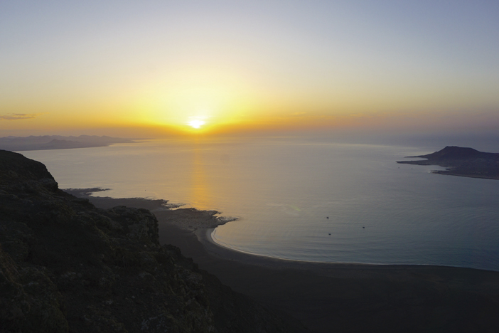 Playa de El Salado, muy cerca de Caleta del Sebo y desde su orilla vemos el Risco de Famara. Cuenta con algunos servicios y es el único lugar donde se puede acampar en una zona señalizada, tras solicitar el permiso correspondiente