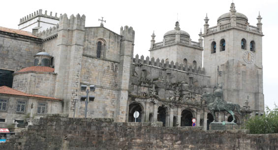 El inicio de su construcción fecha de la primera mitad del siglo XII, y se prolongó hasta principios del siglo XIII. Ese primer edificio, de estilo románico, sufrió muchas alteraciones a lo largo de los siglos. De la época románica datan el carácter general de la fachada con las torres y el bella rosetón, además del cuerpo de la iglesia de tres naves cubierto por bóveda de cañón. La bóveda de la nave céntrica esta sostenida por Arbotantes, siendo la Catedral de Oporto uno de los primeros edificios portugueses en que se utilizó ese elemento arquitectónico.