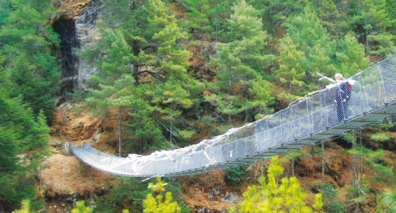 La temperatura va subiendo y la caminata pone en marcha los entumecidos cuerpos. Tras 350 metros de desnivel descendidos y cruzar otro río, aparece la segunda gran pendiente. El paisaje es majestuoso, los puentes tibetanos cada vez son más largos y más altos, pero bien anclados. Repletos de cientos de pañuelos de colores que ondean al viento y rezan a los Dioses.
