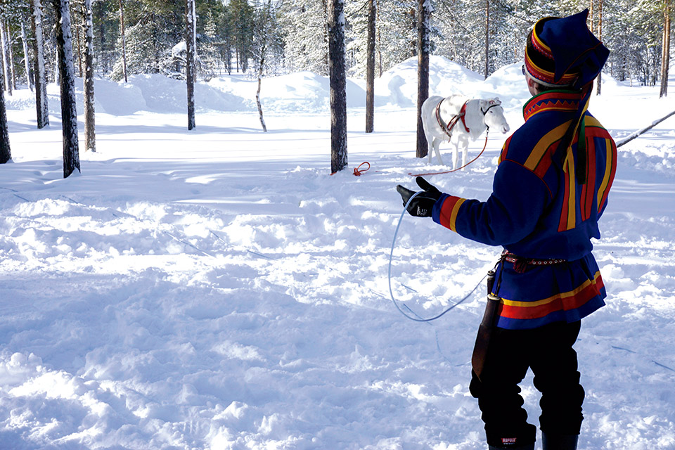 En un principio, llevar la moto requiere toda nuestra atención, pero enseguida comenzamos a disfrutar de los sobrecogedores paisajes. Nos seguimos a una distancia prudencial, adentrándonos en estrechos y sinuosos caminos. Atravesamos espesos bosques donde la nieve deja asombrosas formas sobre ramas y copas, subimos, bajamos lomas y rodeamos lagos congelados. Divisamos algunos renos entre la escasa vegetación, señal de que estábamos llegando a la granja. Con el traje tradicional, un sami sale a nuestro encuentro y nos da la bienvenida.