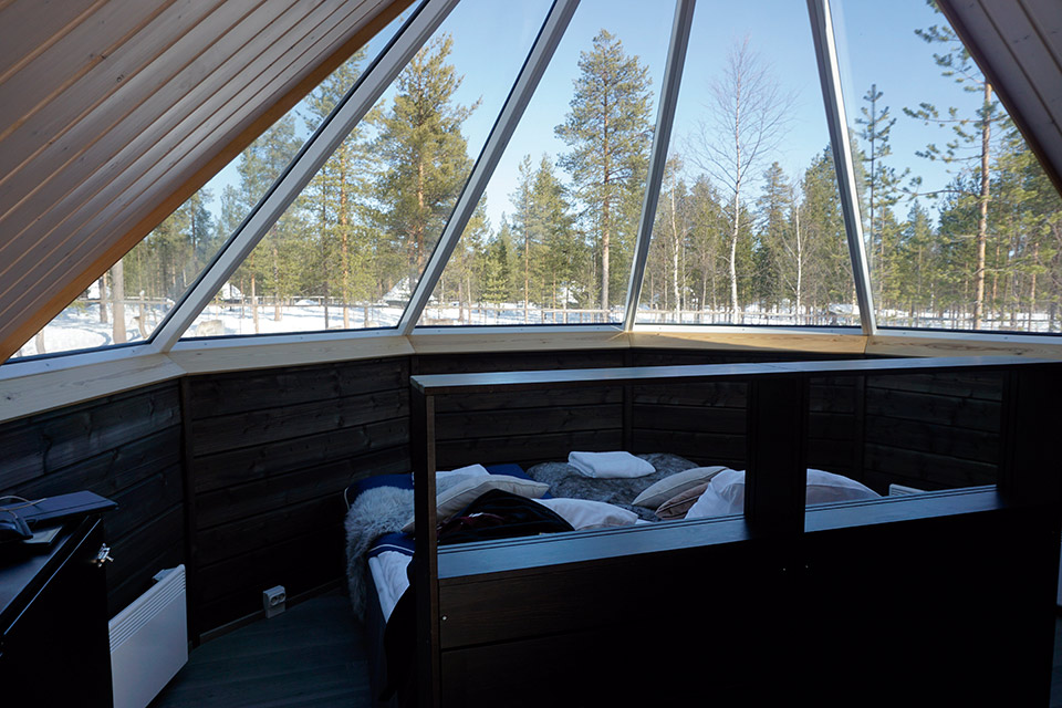 Tras una deliciosa cena, junto a la chimenea del restaurante, nos retiramos a nuestra cabaña. El objetivo, poder observar, a través del techo de cristal, las auroras boreales desde la cama.