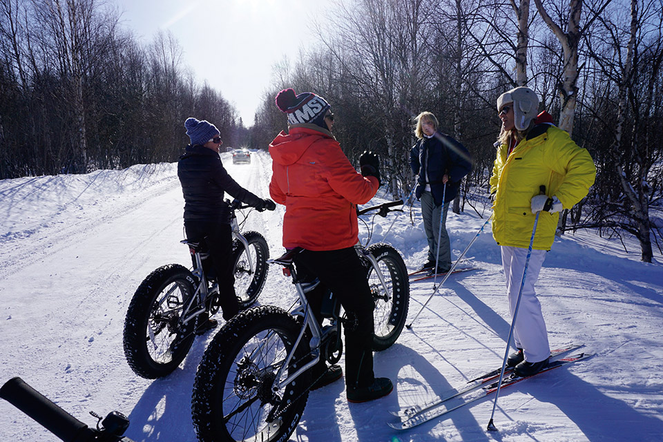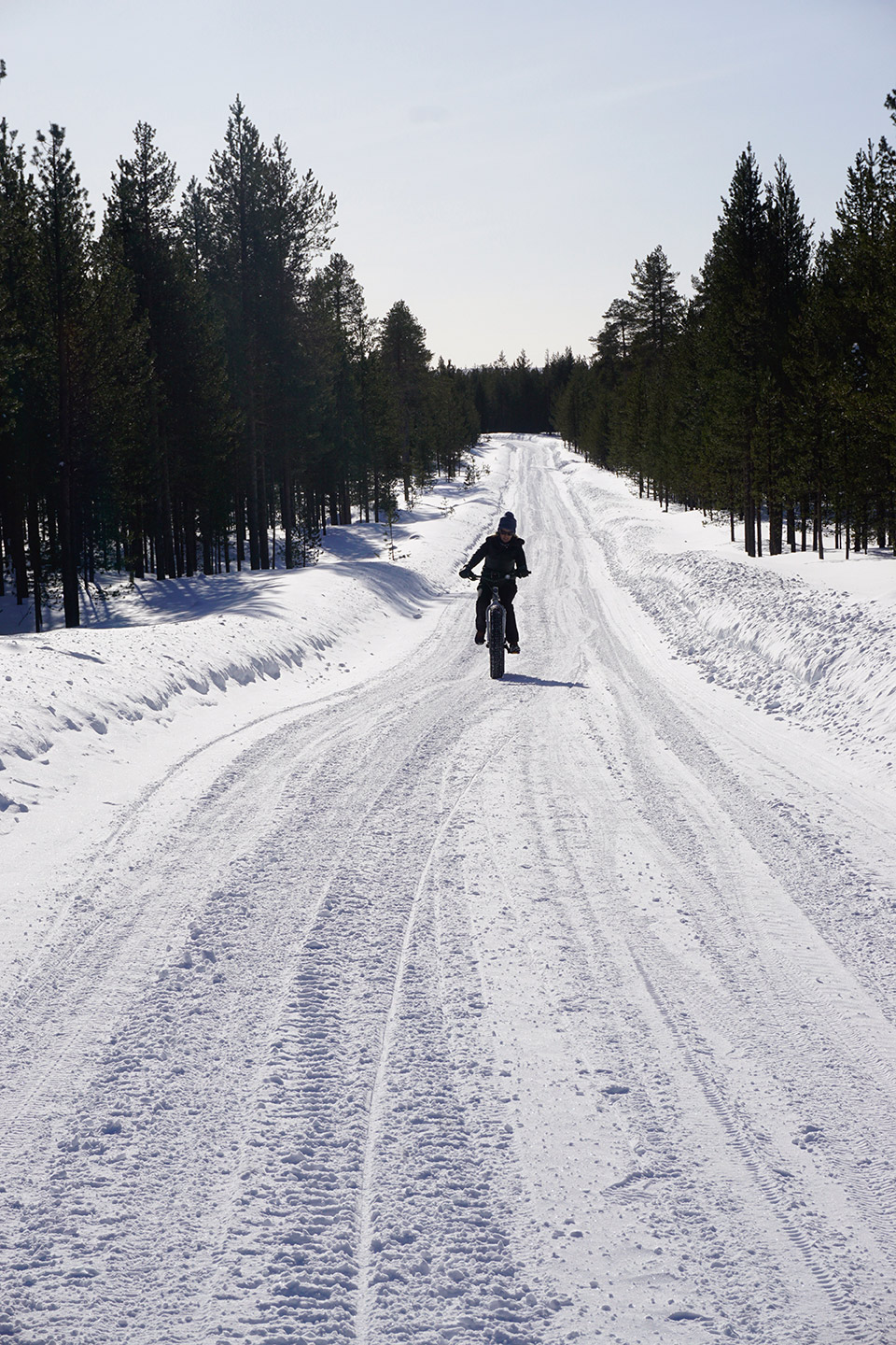 El hotel dispone de un alquiler de bicis eléctricas, con ruedas de clavos (fat-bike), esquís y raquetas para la nieve. Fue maravilloso recorrer en fat- bike los solitarios caminos de nieve profunda, donde encontramos pequeños refugios de madera, para hacer fuego y calentarse.