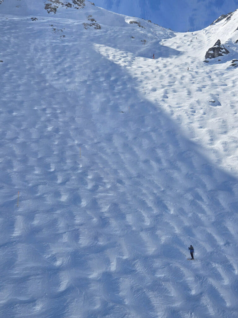 En cuanto al esquí, Mont Fort ofrece una de las pistas más exigentes del dominio, una negra legendaria con fuerte pendiente y terreno irregular, ideal para esquiadores expertos. Su nieve suele mantenerse en excelentes condiciones gracias a la altitud y orientación norte. Los más aventureros pueden además explorar zonas de freeride controlado, siempre bajo precaución. Recomendamos, si no eres un esquiador experimentado, observar la pista desde el mirador antes de decidir bajarla. La fuerte pendiente y el terreno irregular hacen que, en caso de caída, sea difícil detenerse, con las posibles consecuencias que ello implica en un recorrido tan exigente.