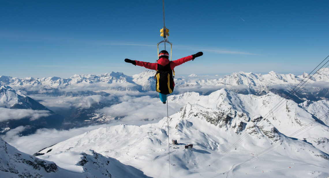 Como hemos dicho, en la cima de Mont Fort, no solo comienza una de las pistas más desafiantes de Verbier: también despega una de las tirolinas más altas y espectaculares de Europa.