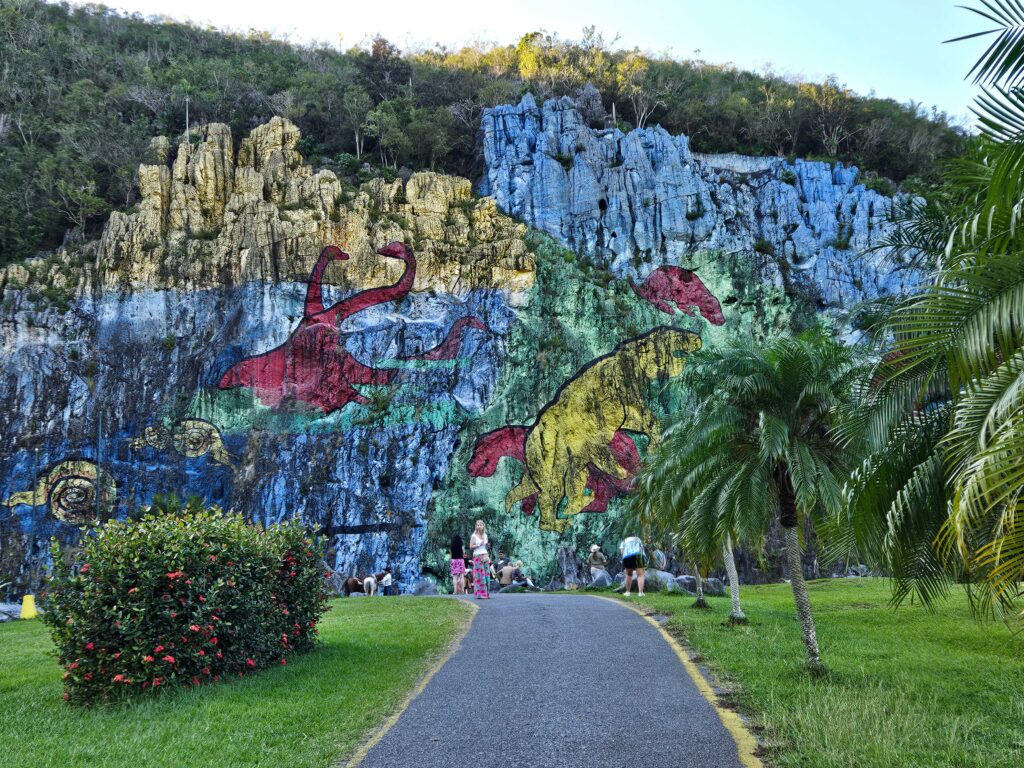 Uno de los puntos más emblemáticos de la región es el Mural de la Prehistoria, una sorprendente obra de arte al aire libre que rompe con el verde intenso del paisaje viñalero. En plena naturaleza, entre mogotes y vegetación exuberante, una explosión de color se despliega sobre la ladera del mogote Pita: se trata de una gigantesca pintura en la roca que ilustra la evolución de la vida en la región.
