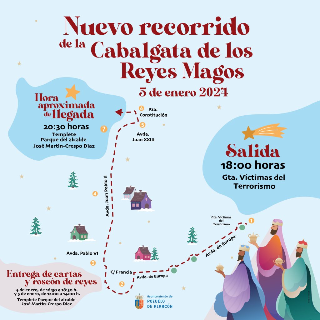 Este año la Cabalgata en Pozuelo estrenará itinerario, que pasará por vías más amplias, y con el que se ha buscado evitar parones provocados por las difíciles maniobras en calles estrechas. Se consigue así terminar a una hora más prudente para los niños y mejorar las condiciones de seguridad y visibilidad para todos.