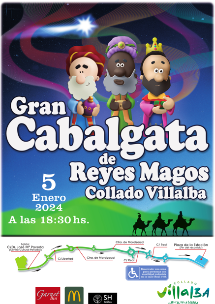 La comitiva real, en la que estarán Sus Majestades los Reyes Melchor, Gaspar y Baltasar, partirá a las 18:30 h. del Centro Cultural Peñalba. En su recorrido, atravesará las calles José María Poveda, Libertad, carretera de Moralzarzal y calle Real, para finalizar en la Plaza de la Estación.
